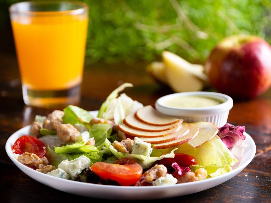 Nozes carameladas, carpaccio de maçã, formaggio blu, tomate cereja, mix de folhas e molho mostarda & mel